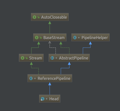 Stream事实上是一个接口,并没有操作的缺省实现.最主要的实现是ReferencePipeline,而ReferencePipeline继承自AbstractPipeline,AbstractPipeline实现了BaseStream接口并实现了它的方法.